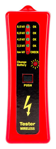 • zeigt die Spannung durch vier leuchtstarke grüne Dioden in vier Stufen an: 2500 - 8000 Volt
